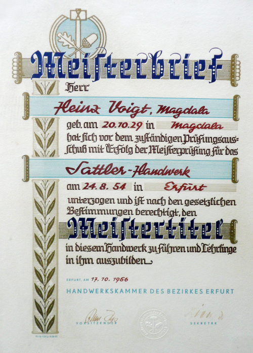Heinz Voigt Sattlermeister geb. 20.10.1929 übernahm das Geschäft am 1.1.1955 und führte es bis 1995.