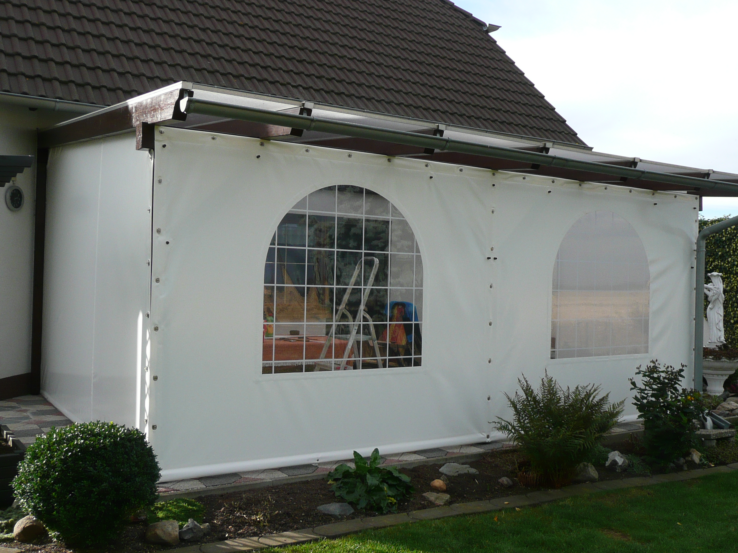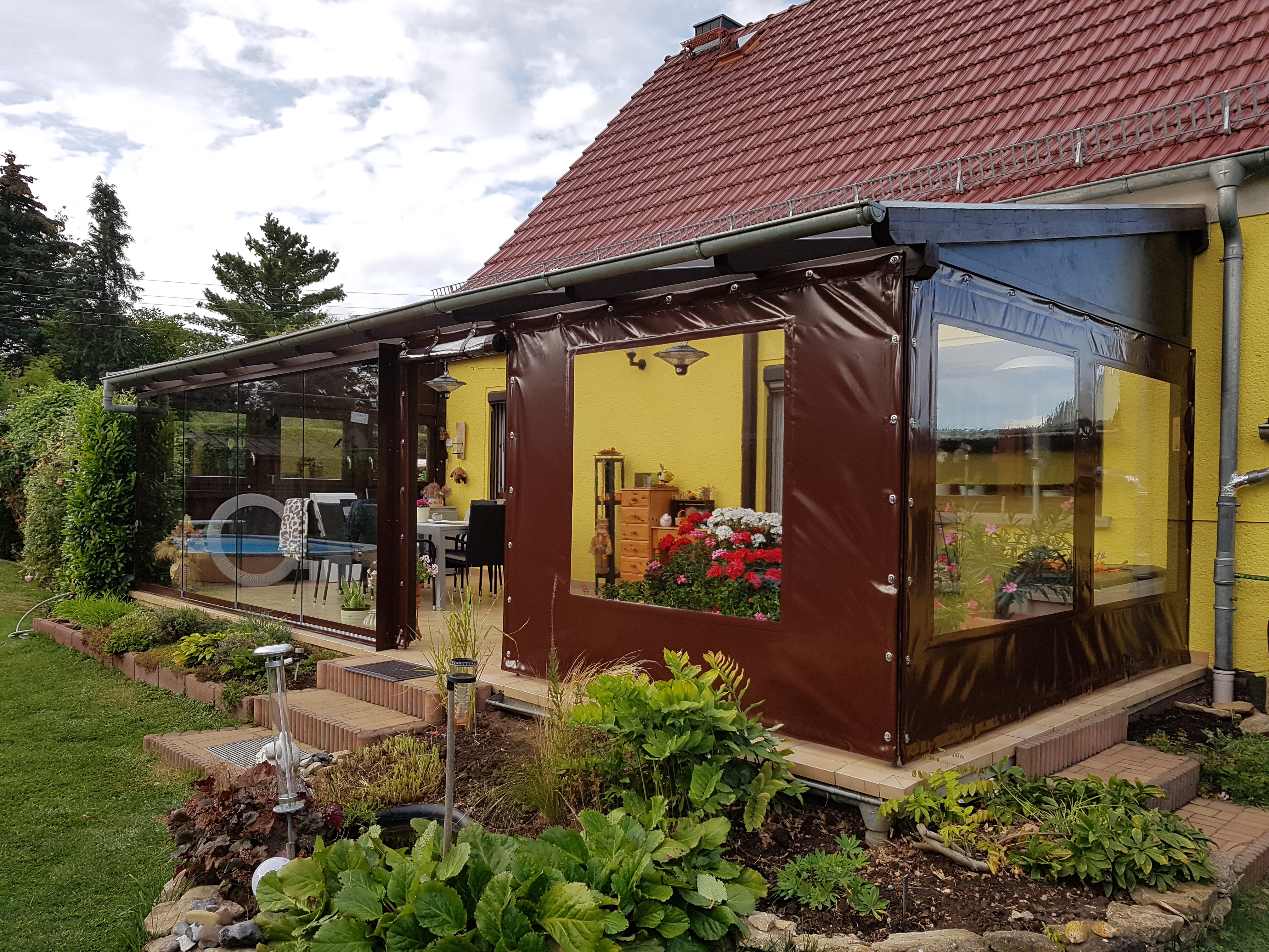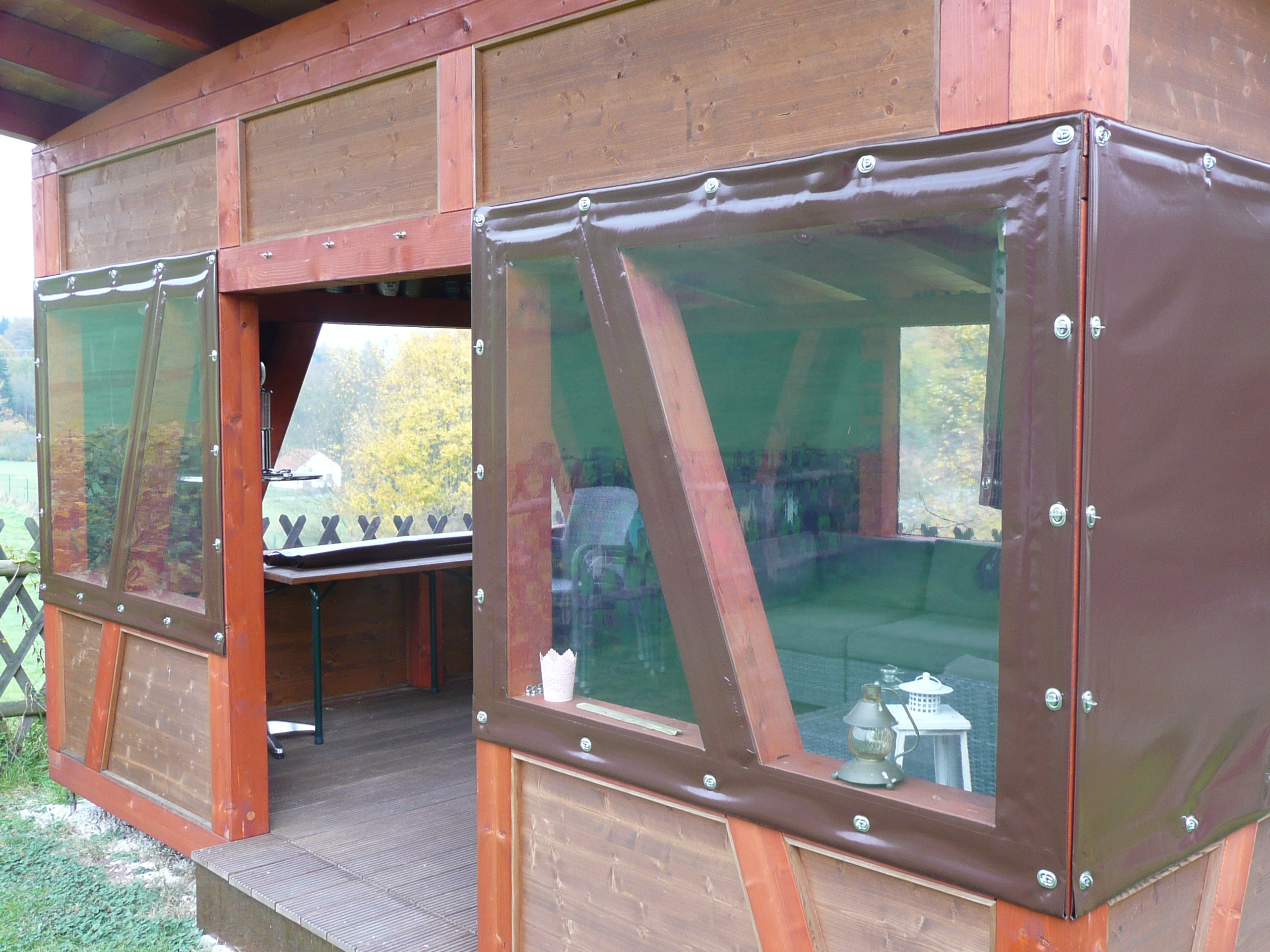 Terrassenverkleidung aus Planenstoff mit Foliefenstern